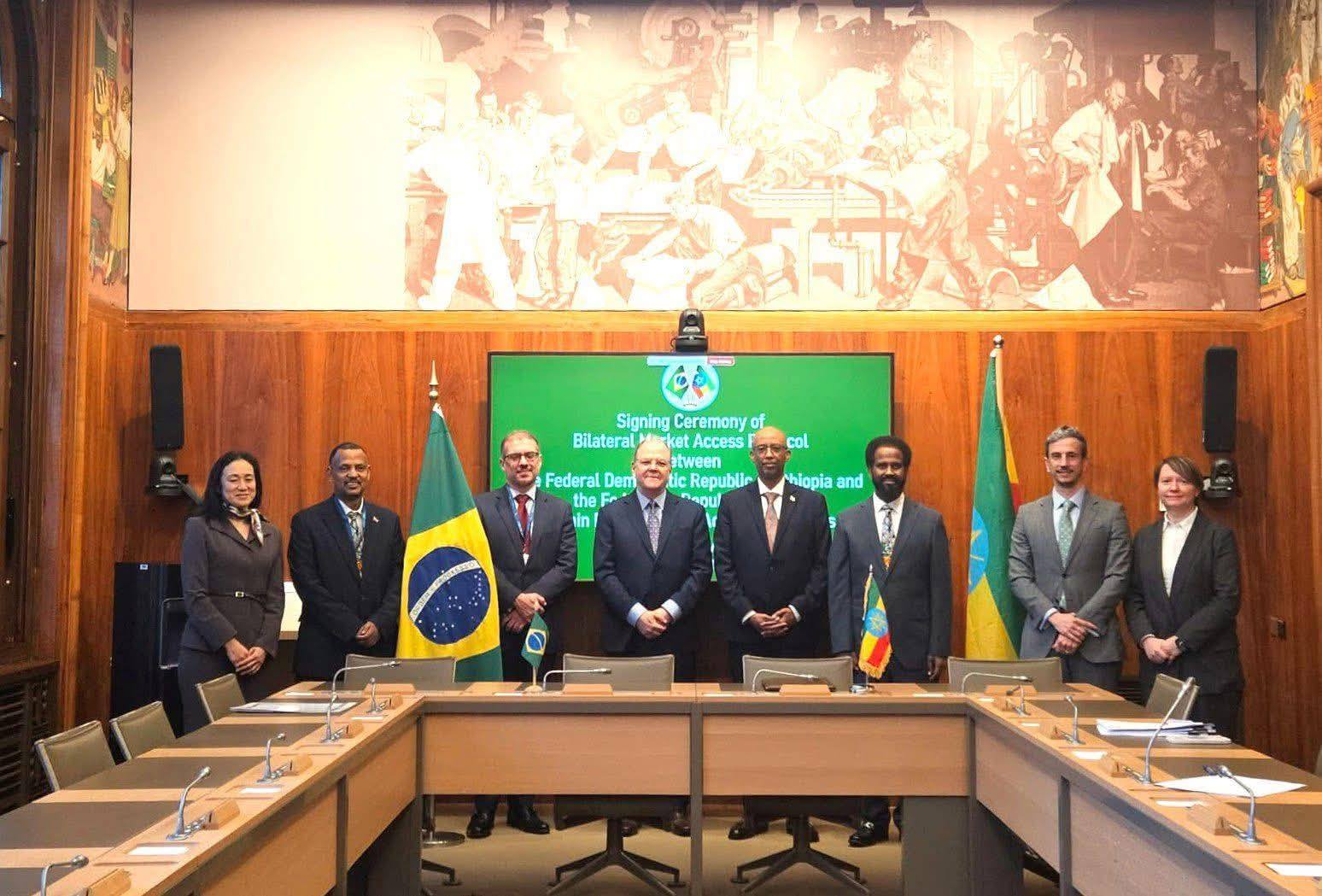 وقّع البروتوكول كلٌّ من السفير تسجاب كيبيبيو، المندوب الدائم لإثيوبيا لدى مكتب الأمم المتحدة في جنيف والمنظمات الدولية الأخرى في سويسرا، والسفير غيلهيرمي دي أغيار باتريوتا، المندوب الدائم للبرازيل لدى منظمة التجارة العالمية، وفقاً لوزارة الخارجية.