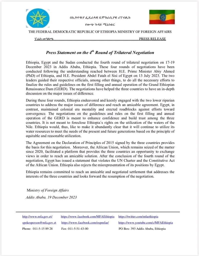 In a press statement issued on 4th Round of Trilateral Negotiation on Grand Ethiopian Renaissance Dam (GERD), the Ministry of Foreign Affairs noted after the conclusion of the fourth round of the negotiation, Egypt has issued a statement that violates the UN Charter and the Constitutive Act of the African Union.