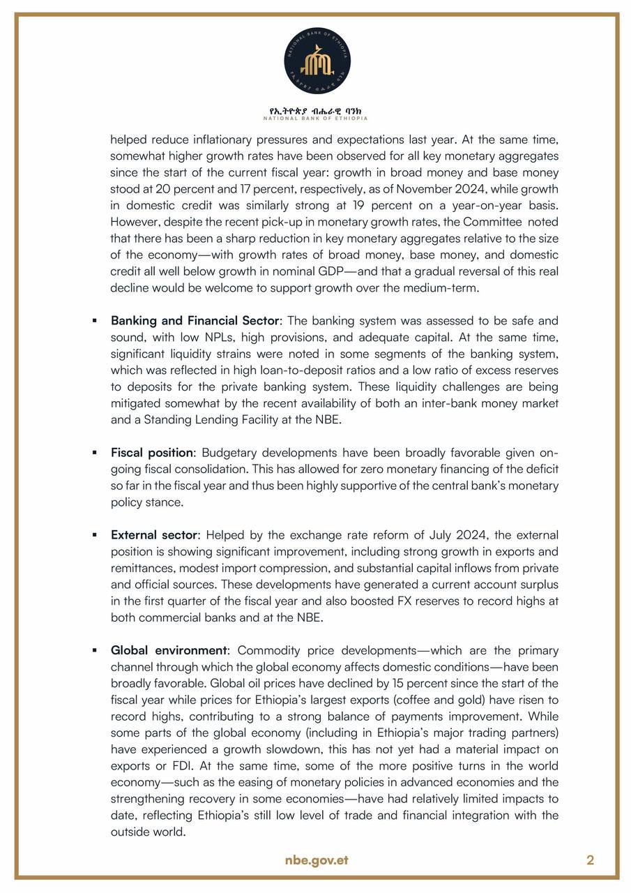In this context, the MPC reviews Ethiopia's latest inflation developments, trends in the fiscal, external, and financial sectors, broader economic activity indicators, and global conditions that have a material impact on domestic conditions.