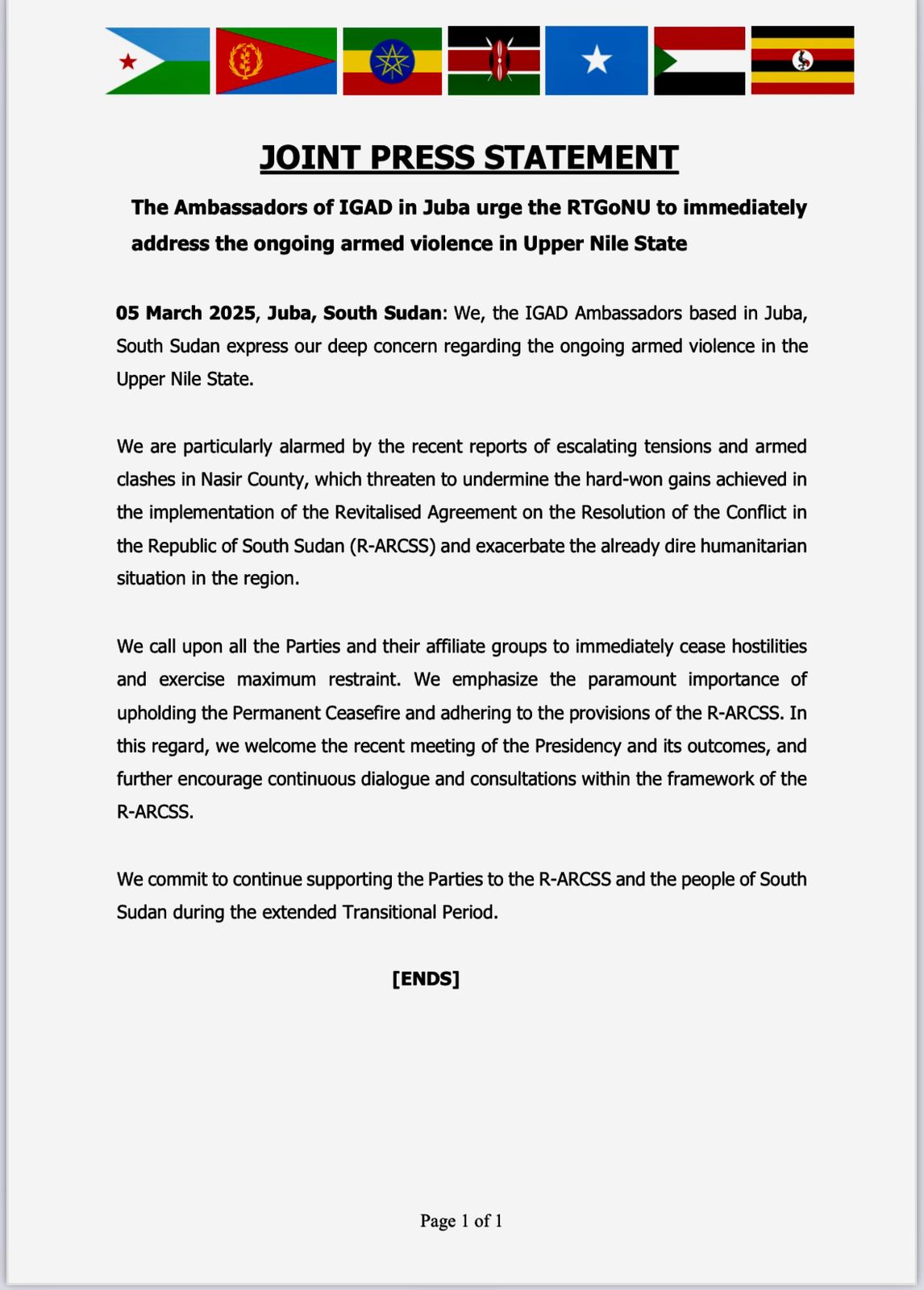In their joint statement today, the envoys said: “We, the IGAD Ambassadors based in Juba, South Sudan express our deep concern regarding the ongoing armed violence in the Upper Nile State.”