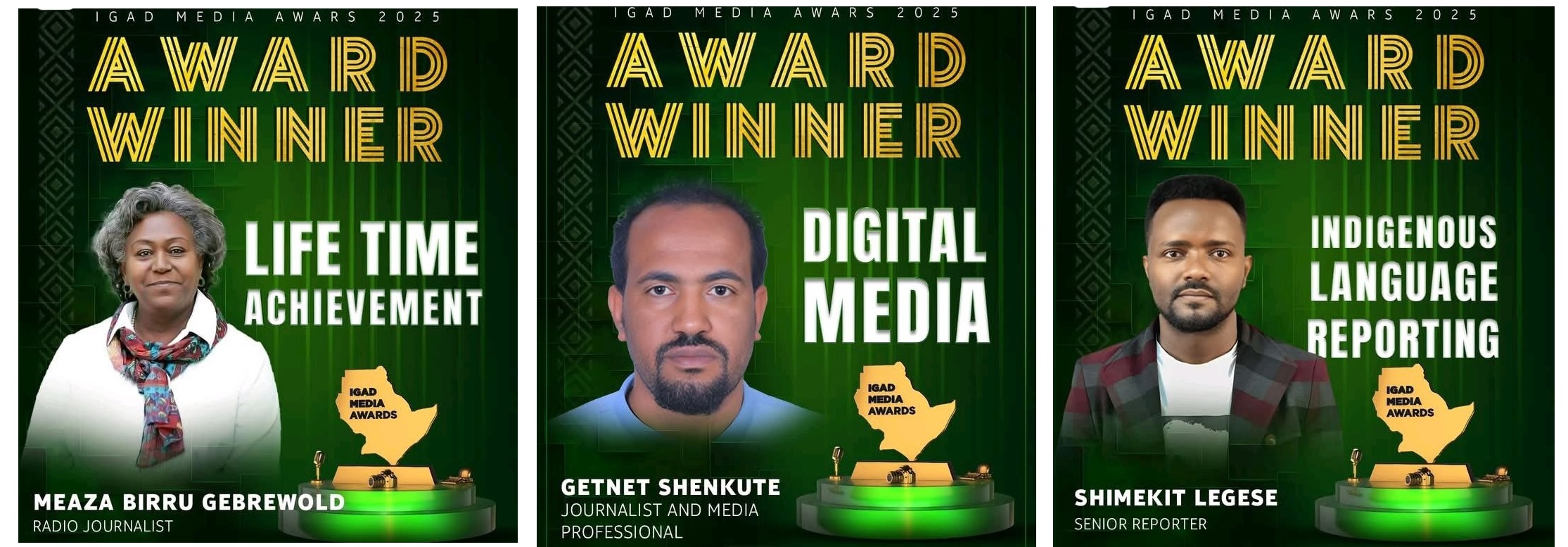 The three Ethiopian Journalists shine at the IGAD Media Awards 2025, marking the country's growing excellence in media across the region.