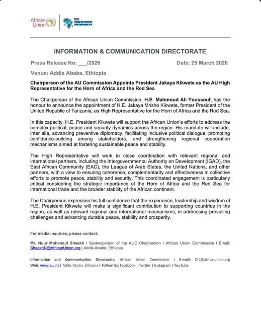 Addis-Abeba, le 20 mars 2026 (ENA) : - À l’occasion de l’Aïd al-Fitr, le président de la Commission de l’Union africaine, Mouhamed Ali Yousuf, a exprimé ses vœux les plus chaleureux à la communauté musulmane en Afrique et dans le reste du monde. Dans son allocution, Mahmouda présenté l’Aïd al-Fitr comme un moment sacré marquant la fin du Ramadan, invitant à la réflexion, à la gratitude et au renouveau spirituel. Il a rappelé que cette fête véhicule des valeurs durables telles que la compassion, la solidarité et la générosité, des principes essentiels face aux défis mondiaux actuels. Le président a souligné que le monde est confronté à d’importantes épreuves, notamment les conflits, les déplacements de populations, l’instabilité économique et les pressions climatiques. « Notre humanité commune est mise à l’épreuve comme jamais auparavant », a-t-il déclaré, insistant sur la nécessité d’une responsabilité collective. Malgré ces difficultés, Mahmoud a appelé à cultiver l’espoir et l’unité. Il a encouragé les individus et les communautés à renforcer la coopération entre les nations, à soutenir les populations vulnérables et à réaffirmer leur engagement en faveur de la paix, de la justice et de la dignité humaine. Il a également rappelé de penser à ceux qui traversent des moments difficiles pendant les festivités et a exprimé l’espoir que l’Aïd al-Fitr inspire des actions collectives pour bâtir un monde plus juste, inclusif et pacifique.