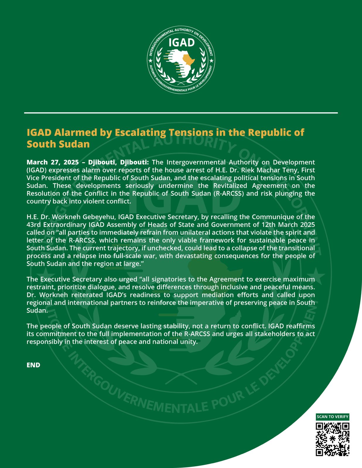 Le secrétaire exécutif de l'IGAD, Workneh Gebeyehu, a appelé « toutes les parties à s'abstenir immédiatement de toute action unilatérale contraire à l'esprit et à la lettre du R-ARCSS, qui demeure le seul cadre viable pour une paix durable au Soudan du Sud ».