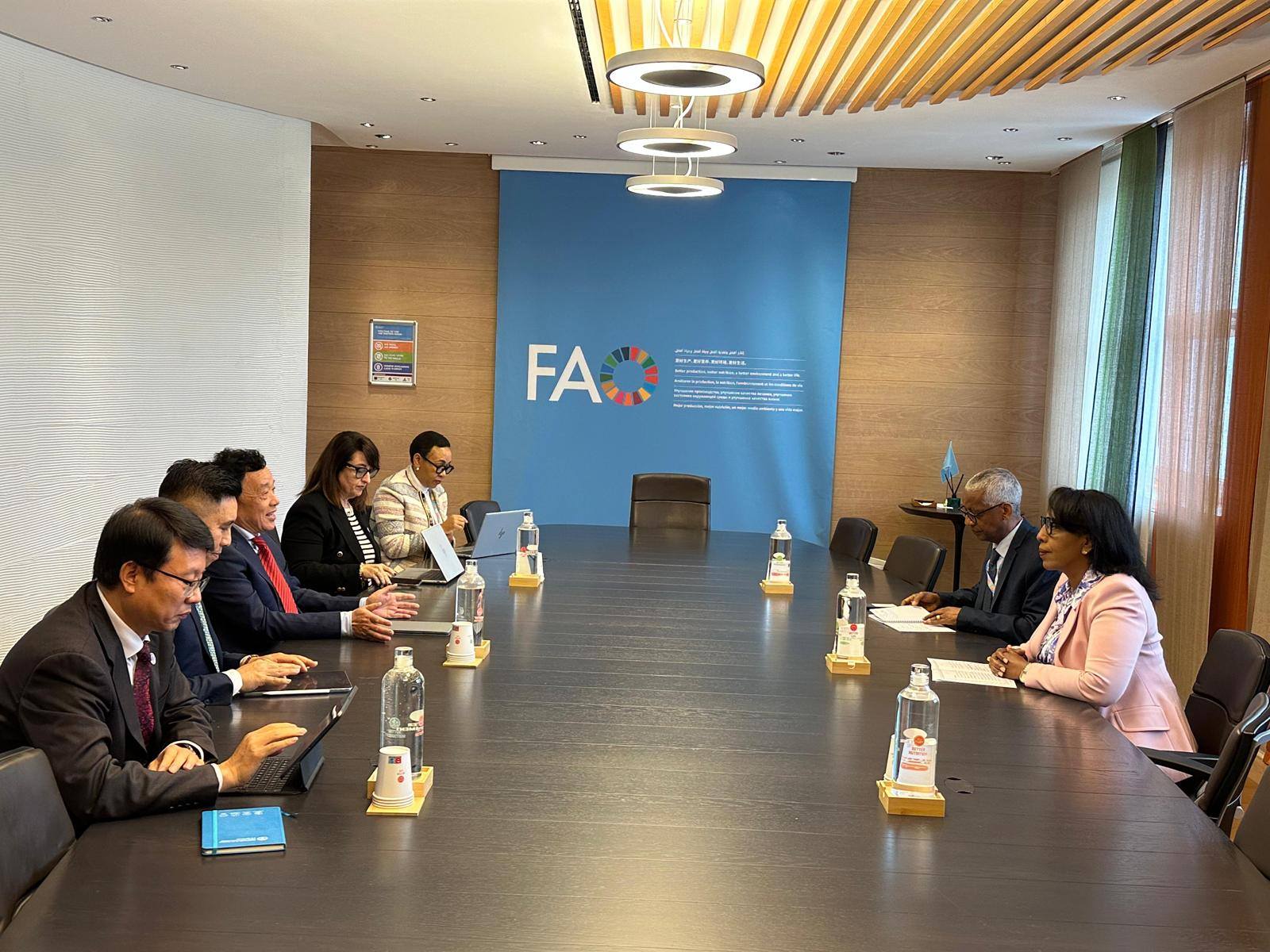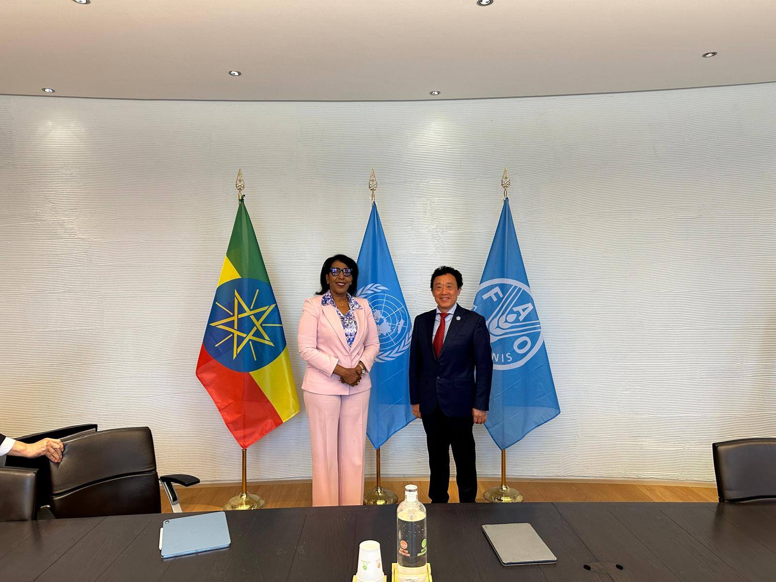 L'ambassadrice extraordinaire et plénipotentiaire d'Éthiopie en Italie et représentante permanente des agences des Nations Unies basées à Rome, Demitu Hambisa, s'est entretenue avec Qu Dongyu, directeur général de l'Organisation mondiale pour l'alimentation et l'agriculture, au siège de l'organisation.