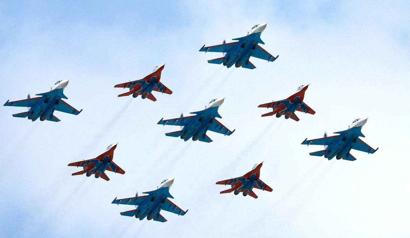Lors de la partie aérienne du défilé, l'équipe de voltige « Chevaliers et Swifts russes » a effectué un numéro avec neuf avions Su-30 et Mig-29.
