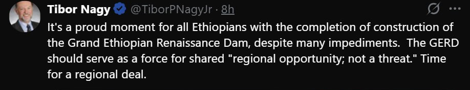 Addis-Abeba, le 4 juillet 2025 (ENA) : - L’ancien secrétaire d’État adjoint des États-Unis aux Affaires africaines, l’ambassadeur Tibor Nagy, a indiqué sur son compte X que le Grand barrage de la Renaissance devrait être une force d’opportunité régionale partagée, et non une menace.
