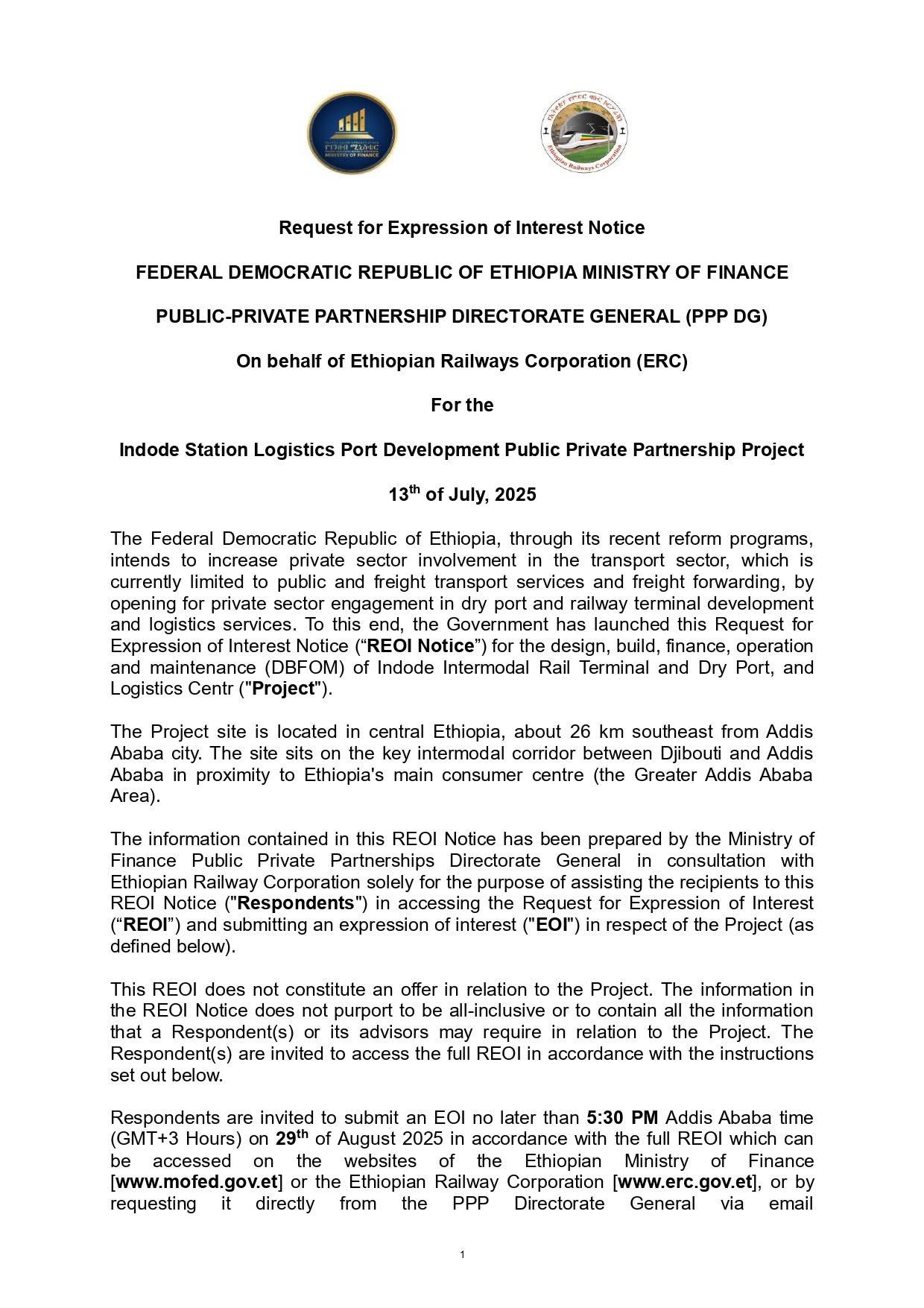 Addis-Abeba, le 16 juillet 2025 (ENA) : - Le ministère des Finances, en collaboration avec la Société des chemins de fer éthiopiens, invite les investisseurs internationaux et locaux à manifester leur intérêt pour le développement du terminal ferroviaire intermodal, du port sec et du centre logistique d'Indode, un projet stratégique de partenariat public-privé (PPP) situé à seulement 26 km au sud-est d'Addis-Abeba.