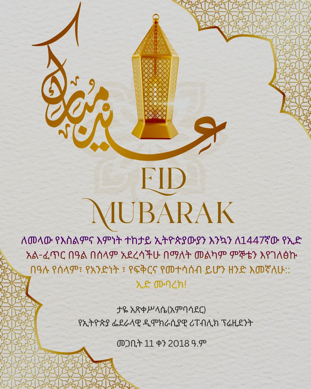 Addis-Abeba, le 20 mars 2026 (ENA) : - Le président Taye Atske Selassie a exprimé ses vœux les plus chaleureux à la communauté musulmane à l’occasion de l’Aïd al-Fitr, célébrant la fin du mois sacré du Ramadan.