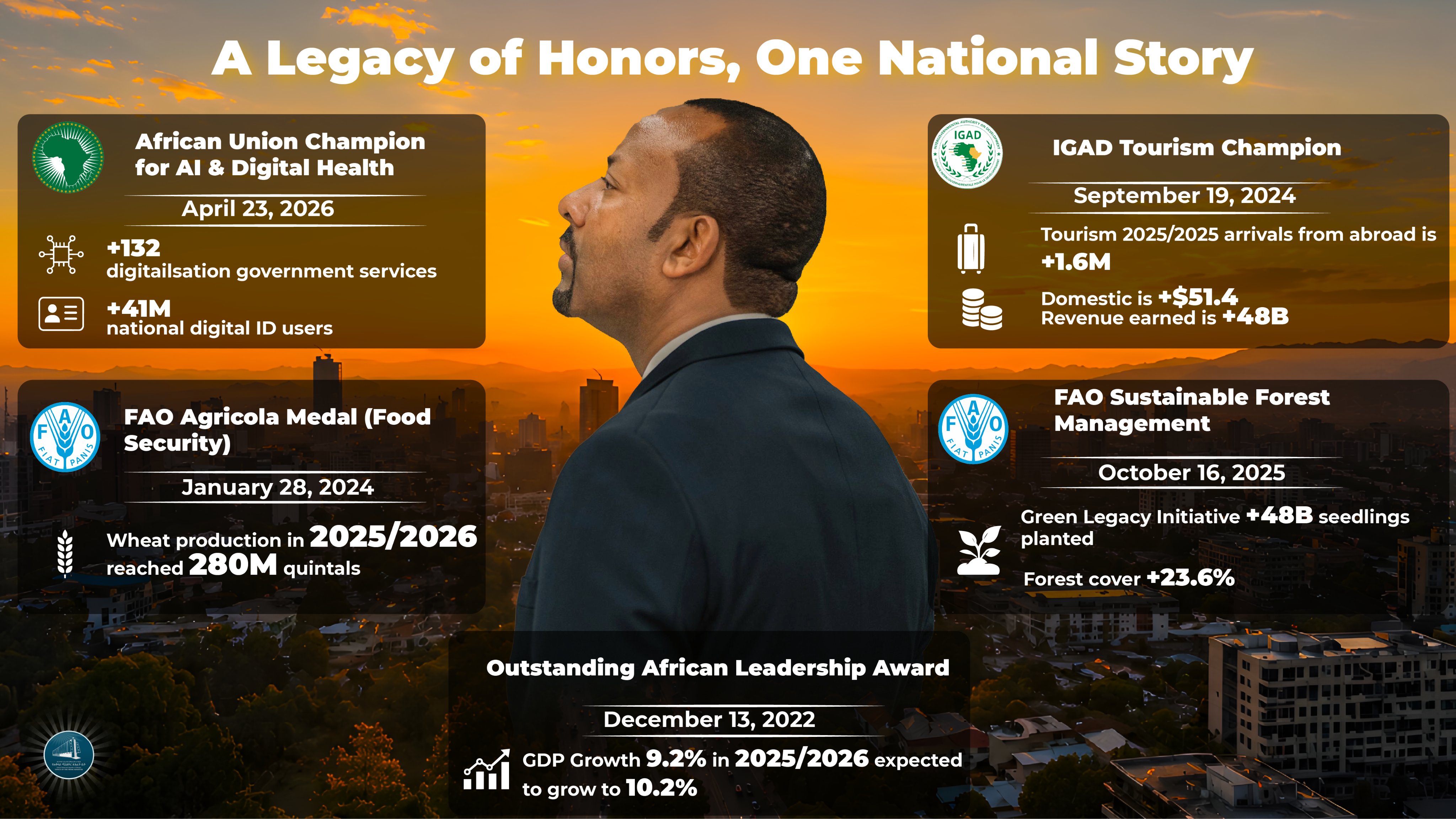 Parmi celles-ci figurent notamment le Prix de la FAO, la Médaille Agricola, le Prix du leadership africain exceptionnel ainsi que son rôle de Champion du tourisme de l’IGAD.