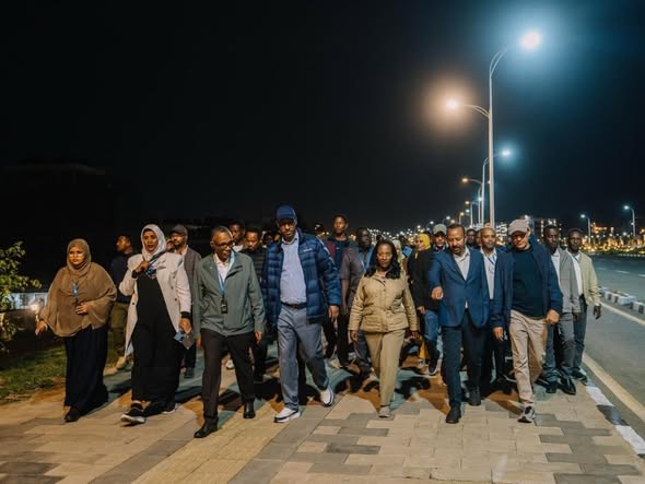Ministirri muummee Dr. Abiyyi Ahimad miseensota hojii raawwachiisaa paartii badhaadhinaa waliin ta’uun hojii misooma kooriidaraa Saar beet-Addababayii Jarman-gaarmant fi naannawa Furii hojiinsaa xumurame daawwatan. - ENA Afaan Oromoo