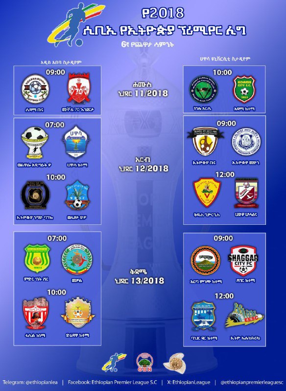 Sagantaa piriimer liigii Itiyoophiyaa torban 6ffaan hanga sadaasa 13 bara 2018 ni tura.