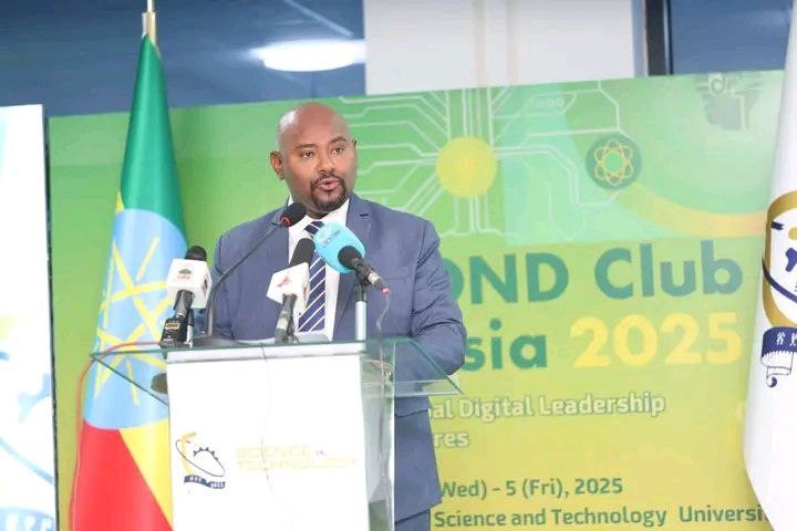 Simpooziyeemiin Kilabii Daayimandii bara 2025 Yunivarsiitii Saayinsii fi Teeknooloojii Finfinneetiin qophaa'e mata duree " Egeree hammataa uumuuf hoggansa Dijitaalaa Addunyaa Cimsuu " jedhuun gaggeeffamaa jira.