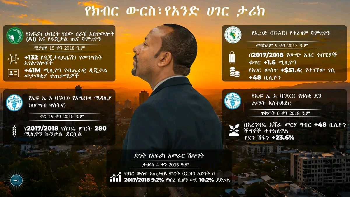 Gamtaan Afrikaa dhiyeenya kana Ministira Muummee Doktar Abiyyi Ahimadiin Shaampiyoonaa Hubannoo Namtolchee fi fayyaa dijitaalawaa gochuun muuduun , badhaasni dhaabbata Nyaataafi Qonnaa dursanii fudhatan, meedaaliyaan Agrii-kollaa, badhaasni hoggansa olaanaa Afrikaa fi beekamtiin Shaampiyoonummaa Tuurizimii ‘IGAD’ kanaaf mirkaneessituuwwanidha.