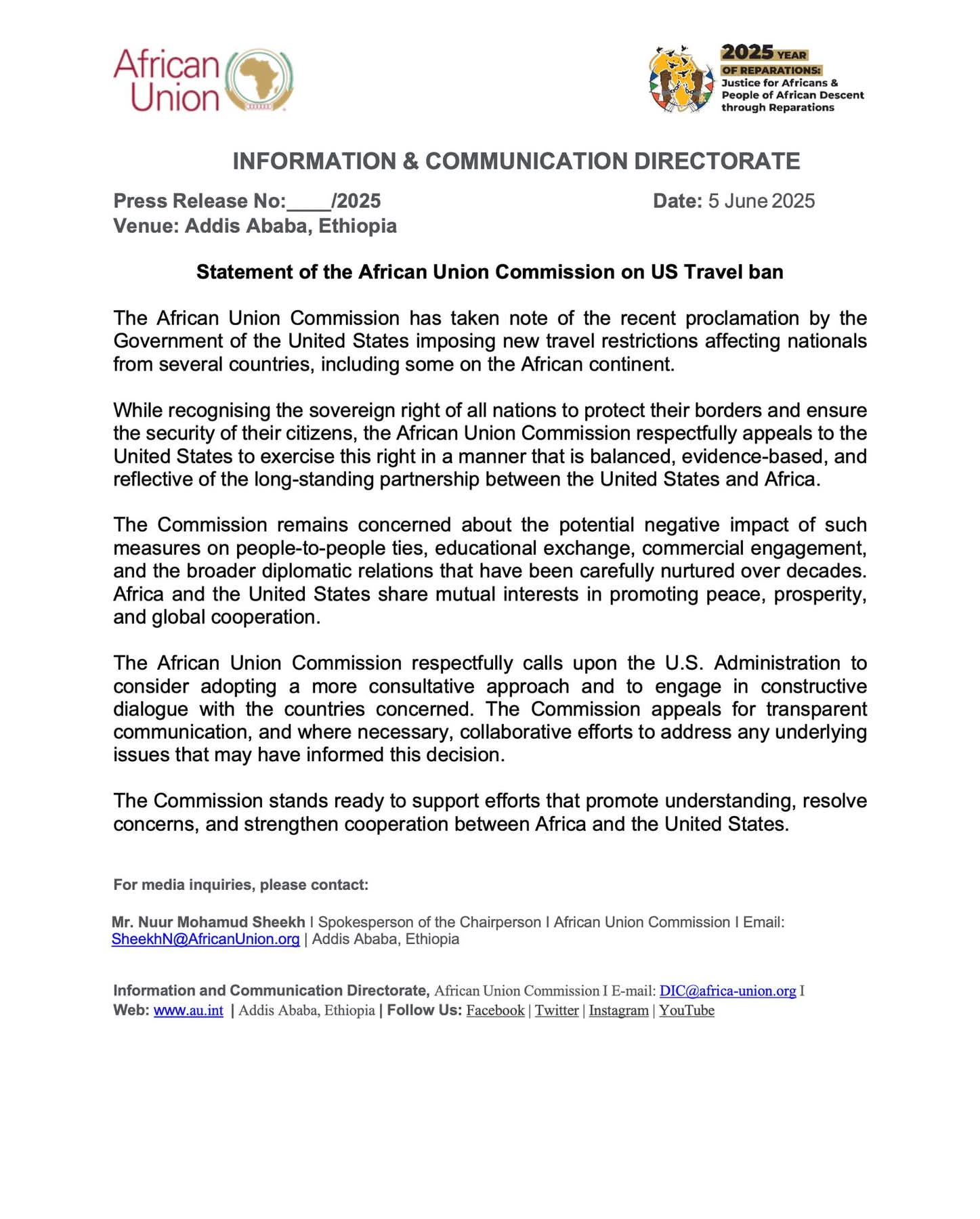 Bayaanka Komishinka Midowga Afrika ee ku saabsan xayiraadda socdaalka ee Maraykanka