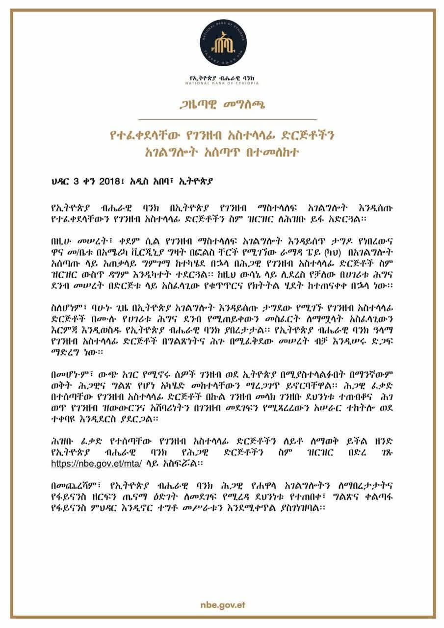 Bangiga Qaran ee Itoobiya ayaa si rasmi ah u shaaciyay shirkadaha loo oggolaaday inay bixiyaan adeegyada xawaaladaha lacagta - ENA Af-Soomaali