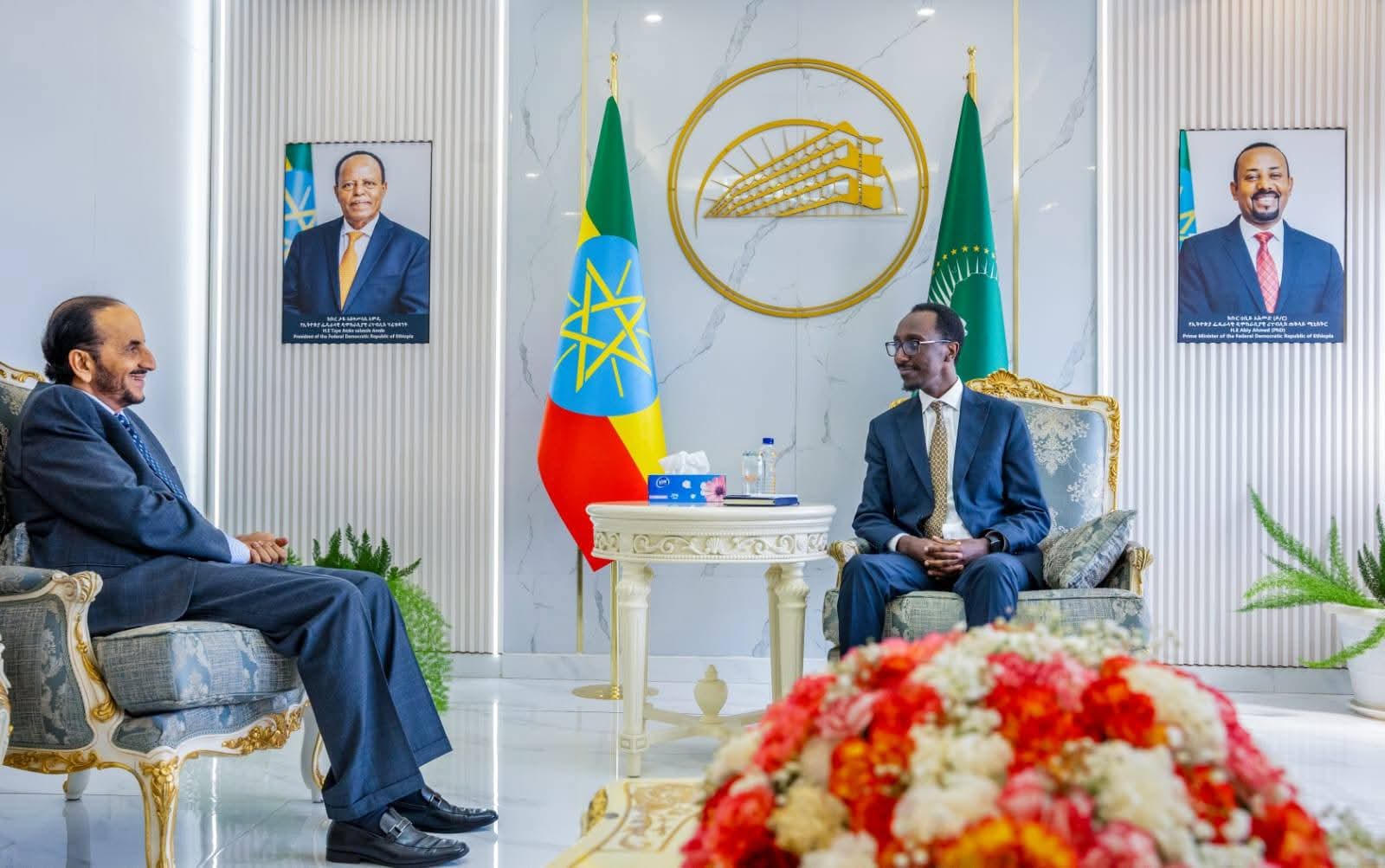 Wasiirka Arrimaha Dibadda ee Itoobiya, Dr. Gedhiyoon Timootiwoos, ayaa la yeeshay kulan xafiiskooda ah Wasiiru Dowlaha Arrimaha Dibadda ee Cumaan ee Arrimaha Siyaasadda, Sheekh Khaliifa Bin Cali Al-Hartin.