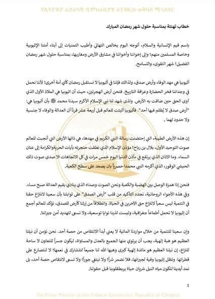Ra’iisul Wasaare Abiy Ahmed (Dr.) ayaa farriin hambalyo ah oo ku saabsan bisha barakeysan ee Ramadaan u diray dhammaan Muslimiinta caalamka, taas oo uu ku gudbiyay afka Carabiga
