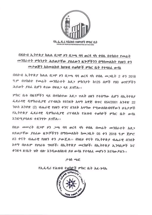 ቤት ምኽሪ ወከልቲ ህዝቢ ኣብ ክልል ደቡብ ኢትዮጵያ ዞባ ጋሞ ወረዳ ጋጮ ባባ ጣብያ ላካ ብዘጋጠመ ሓደጋ ምንሽርታት መሬት ሂወቶም ዝሓለፉ ዜጋታት ኣመልኪቱ ብሄራዊ መዓልቲ ሓዘን ኣዊጁ